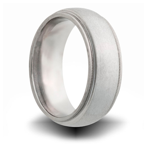 Titanium ring has a domed center with brushed finish and milgrain edges. Width: 8mm. Enjoy manufacturer's lifetime warranty for re-sizing and re-furbishing. Made of aircraft grade titanium in the USA. Deluxe comfort fit. Aircraft grade titanium [Ti 6Al-8V] is comprised of 90% titanium, 6% aluminum, 8% vanadium. It is hypoallergenic and guaranteed not to cause allergic reactions, skin irritations or discoloration of any sort. While pure grades of titanium [99.9%] used in most other titanium jewelry is very durable, Ti 6Al-8V is 2x stronger and 2.5x to 5x harder. This alloy has a tensile strength of up to 150,000 psi and a Brinell hardness value of 330.