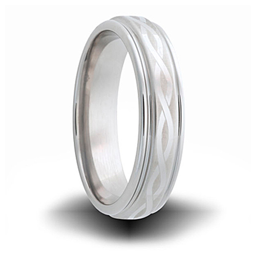 Infinity symbol pattern cobalt ring has a polished finish with rounded edges. Comfort fit. Laser engraved design. Width: 6mm. Made in USA. Cobalt rings are made from a unique alloy blend that consists of cobalt and other substances to offer a bright white alternative metal. It will never need plating and is so white it is often compared to platinum in color. This metal is bio-inert, making it compatible to the body. Cobalt is commonly used in detistry and artificial joints because of its lighter weight and resistance to corrosion. Cobalt is harder than platinum with a scratch resistant surface. It will not break, shatter or chip thus providing extreme durability and wear. The luster and finish will not fade or tarnish in any way. Cobalt can be polished as you would a platinum ring.