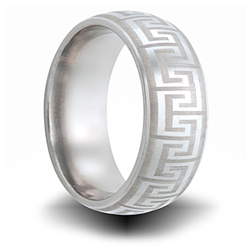 Cobalt 8mm domed ring has a laser engraved greek key design. Deluxe comfort fit. Polished finish. Cobalt rings are made from a unique alloy blend that consists of cobalt and other substances to offer a bright white alternative metal. It will never need plating and is so white it is often compared to platinum in color. This metal is bio-inert, making it compatible to the body. Cobalt is commonly used in detistry and artificial joints because of its lighter weight and resistance to corrosion. Cobalt is harder than platinum with a scratch resistant surface. It will not break, shatter or chip thus providing extreme durability and wear. The luster and finish will not fade or tarnish in any way. Cobalt can be polished as you would a platinum ring.