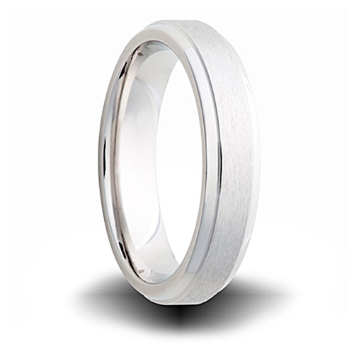 Cobalt ring has a brushed flat center and polished step down edges. Deluxe comfort fit. Width: 6mm. Made in USA. Cobalt rings are made from a unique alloy blend that consists of cobalt and other substances to offer a bright white alternative metal. It will never need plating and is so white it is often compared to platinum in color. This metal is bio-inert, making it compatible to the body. Cobalt is commonly used in detistry and artificial joints because of its lighter weight and resistance to corrosion. Cobalt is harder than platinum with a scratch resistant surface. It will not break, shatter or chip thus providing extreme durability and wear. The luster and finish will not fade or tarnish in any way. Cobalt can be polished as you would a platinum ring.