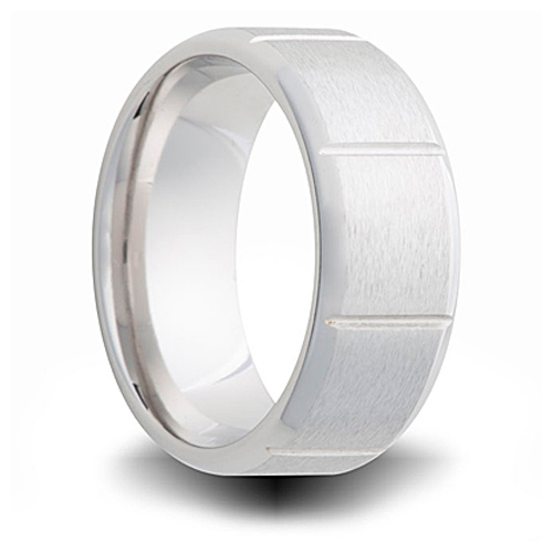 Deluxe comfort fit. Brushed finish, pipe cut band. Width: 8mm. Cobalt rings are made from a unique alloy blend that consists of cobalt and other substances to offer a bright white alternative metal. It will never need plating and is so white it is often compared to platinum in color. This metal is bio-inert, making it compatible to the body. Cobalt is commonly used in detistry and artificial joints because of its lighter weight and resistance to corrosion. Cobalt is harder than platinum with a scratch resistant surface. It will not break, shatter or chip thus providing extreme durability and wear. The luster and finish will not fade or tarnish in any way. Cobalt can be polished as you would a platinum ring.