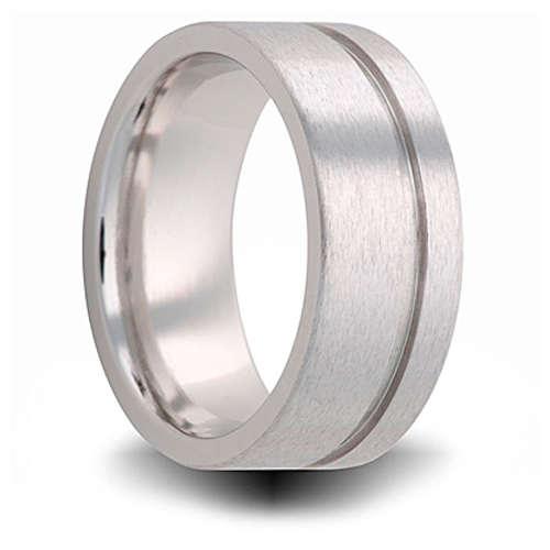 Deluxe comfort fit. Brushed finish, pipe cut band. Width: 8mm. Cobalt rings are made from a unique alloy blend that consists of cobalt and other substances to offer a bright white alternative metal. It will never need plating and is so white it is often compared to platinum in color. This metal is bio-inert, making it compatible to the body. Cobalt is commonly used in detistry and artificial joints because of its lighter weight and resistance to corrosion. Cobalt is harder than platinum with a scratch resistant surface. It will not break, shatter or chip thus providing extreme durability and wear. The luster and finish will not fade or tarnish in any way. Cobalt can be polished as you would a platinum ring.
