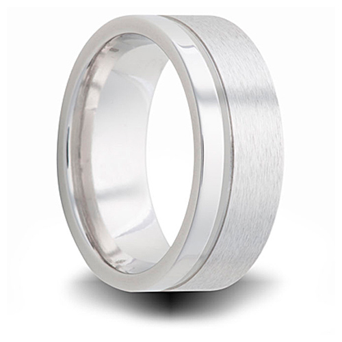 Cobalt 8mm wedding band has an offset groove with polished and brushed finish. Flat center. Deluxe comfort fit. Made in the USA. Cobalt rings are made from a unique alloy blend that consists of cobalt and other substances to offer a bright white alternative metal. It will never need plating and is so white it is often compared to platinum in color. This metal is bio-inert, making it compatible to the body. Cobalt is commonly used in detistry and artificial joints because of its lighter weight and resistance to corrosion. Cobalt is harder than platinum with a scratch resistant surface. It will not break, shatter or chip thus providing extreme durability and wear. The luster and finish will not fade or tarnish in any way. Cobalt can be polished as you would a platinum ring.