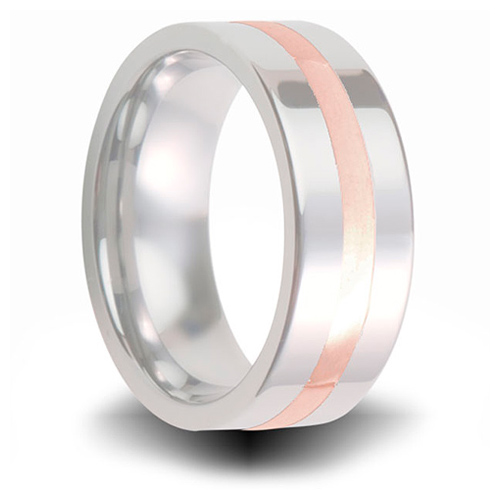 Cobalt 8mm wedding band features a 14kt rose gold inlay. Polished finish, pipe cut ring. Deluxe comfort fit. Cobalt rings are made from a unique alloy blend that consists of cobalt and other substances to offer a bright white alternative metal. It will never need plating and is so white it is often compared to platinum in color. This metal is bio-inert, making it compatible to the body. Cobalt is commonly used in detistry and artificial joints because of its lighter weight and resistance to corrosion. Cobalt is harder than platinum with a scratch resistant surface. It will not break, shatter or chip thus providing extreme durability and wear. The luster and finish will not fade or tarnish in any way. Cobalt can be polished as you would a platinum ring.