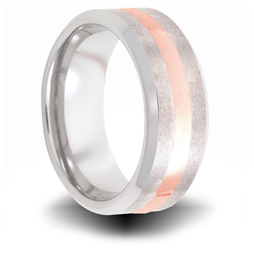 Cobalt 8mm wedding band features a 14kt rose gold inlay. Brushed finish. Deluxe comfort fit. Made in the USA. Cobalt rings are made from a unique alloy blend that consists of cobalt and other substances to offer a bright white alternative metal. It will never need plating and is so white it is often compared to platinum in color. This metal is bio-inert, making it compatible to the body. Cobalt is commonly used in detistry and artificial joints because of its lighter weight and resistance to corrosion. Cobalt is harder than platinum with a scratch resistant surface. It will not break, shatter or chip thus providing extreme durability and wear. The luster and finish will not fade or tarnish in any way. Cobalt can be polished as you would a platinum ring.