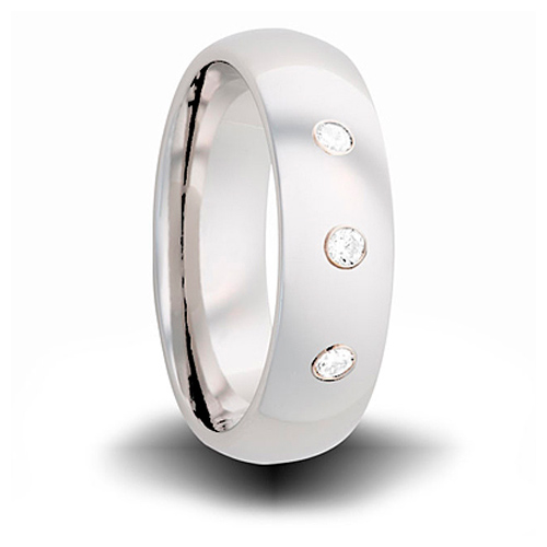 Cobalt 7mm wedding band has three diamond accents. Polished finish, domed center. Deluxe comfort fit. Made in the USA. .06 ct tw diamonds, G color, SI1 clarity. Cobalt rings are made from a unique alloy blend that consists of cobalt and other substances to offer a bright white alternative metal. It will never need plating and is so white it is often compared to platinum in color. This metal is bio-inert, making it compatible to the body. Cobalt is commonly used in detistry and artificial joints because of its lighter weight and resistance to corrosion. Cobalt is harder than platinum with a scratch resistant surface. It will not break, shatter or chip thus providing extreme durability and wear. The luster and finish will not fade or tarnish in any way. Cobalt can be polished as you would a platinum ring.