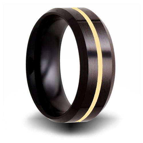 Solid black ceramic ring. Pipe cut ring with beveled edges. High polished mirror finish. 14kt yellow gold inlay. Ring measures 8mm wide. Made in USA. Comfort fit.