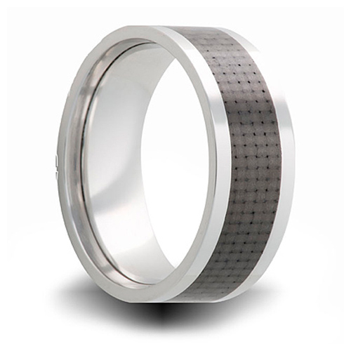Cobalt 8mm ring has a carbon fiber inlay. Polished finish, pipe cut ring. Deluxe comfort fit. Made in the USA. Cobalt rings are made from a unique alloy blend that consists of cobalt and other substances to offer a bright white alternative metal. It will never need plating and is so white it is often compared to platinum in color. This metal is bio-inert, making it compatible to the body. Cobalt is commonly used in detistry and artificial joints because of its lighter weight and resistance to corrosion. Cobalt is harder than platinum with a scratch resistant surface. It will not break, shatter or chip thus providing extreme durability and wear. The luster and finish will not fade or tarnish in any way. Cobalt can be polished as you would a platinum ring.