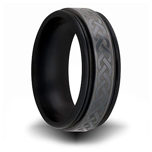 Solid black zirconium ring has a laser etched weave design and channels. High polish edges. Ring measures 7mm wide. Made in USA. Comfort fit. About Black ZirconiumBlackened through an intense thermal process allowing the graphite black color to go several microns deep.This is a superior black finish over black tungsten or titanium as it is not a coating and therefore impossible to rub or scratch off with normal wear.The black does not go all the way through the ring making it possible to mill grooves or custom designs letting the steel-gray luster shine through Is approximately 8 on Mohs scale of hardness.It cannot break or shatter, however it can dent, but it's extremely difficult to do.