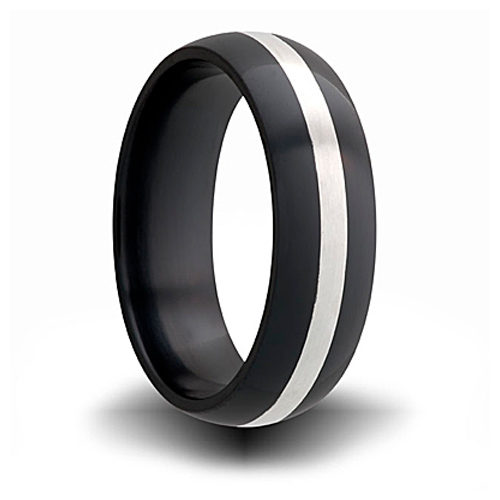 Solid black zirconium ring has a sterling silver inlay in the center. Domed shape and high polish finish. Ring measures 7mm wide. Comfort fit. Made in USA.About Black ZirconiumBlackened through an intense thermal process allowing the graphite black color to go several microns deep.This is a superior black finish over black tungsten or titanium as it is not a coating and therefore impossible to rub or scratch off with normal wear.The black does not go all the way through the ring making it possible to mill grooves or custom designs letting the steel-gray luster shine through Is approximately 8 on Mohs scale of hardness.It cannot break or shatter, however it can dent, but it's extremely difficult to do.