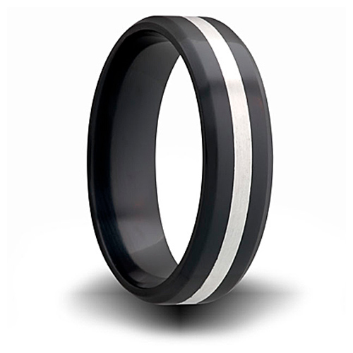 Solid black zirconium ring has a flat center and sterling silver inlay. Comfort fit. High polish finish. Ring is 7mm wide. Made in USA. About Black ZirconiumBlackened through an intense thermal process allowing the graphite black color to go several microns deep.This is a superior black finish over black tungsten or titanium as it is not a coating and therefore impossible to rub or scratch off with normal wear.The black does not go all the way through the ring making it possible to mill grooves or custom designs letting the steel-gray luster shine through Is approximately 8 on Mohs scale of hardness.It cannot break or shatter, however it can dent, but it's extremely difficult to do.