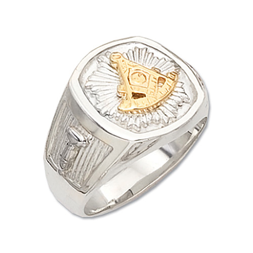 Solid back, polished sterling silver masonic ring with yellow gold features the past master mason insignia on top. Gavel and top hat side emblems. Made in the USA.