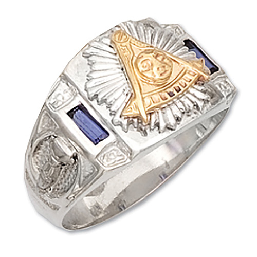 Sterling silver past master mason ring features simulated blue sapphire baguette accent stones. Yellow gold Past Master logo on top. Plumb bob and trowel side emblems. Made in the USA.