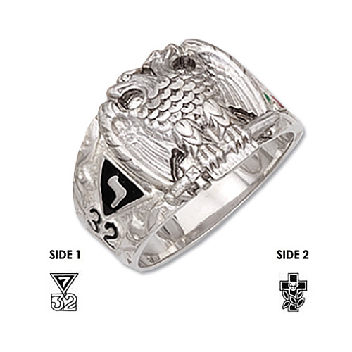 Solid back, polished sterling silver ring with high relief Scottish Rite double headed eagle logo. Anti-tarnish sterlite. Black enamel side emblems Yod and Rose Croix. Size 10 approximate weight: 10.7 grams. Handcrafted in the USA.