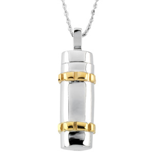 Weight: 13.20 grams. Measures 25.75mm x 10.25mm. Made of polished sterling silver with 14k yellow plated bands. This pendant is a vessel that can hold a precious memento. This item comes with an 18 inch chain, black pouch, funnel, gift box, and a card with inspiration and verse from scripture. From Deborah J. Birdoes' extraordinary Inspirational Blessings Collection of Jewelry. Quotes from Scripture:"In that day he will remove the cloud of gloom, the shadow of death that hangs over the earth. He will swallow up death forever! The Sovereign LORD will wipe away all tears." Isaiah 25:7-8Even when I walk through the dark valley of death, I will not be afraid, for You are close beside me. Your rod and Your staff comfort me. Psalm 23:4Lord, now let thy servant depart in peace, according to Thy word. Luke 2:29Inspiration:For death begins with life's first breath and life begins at the touch of death. John Oxemham