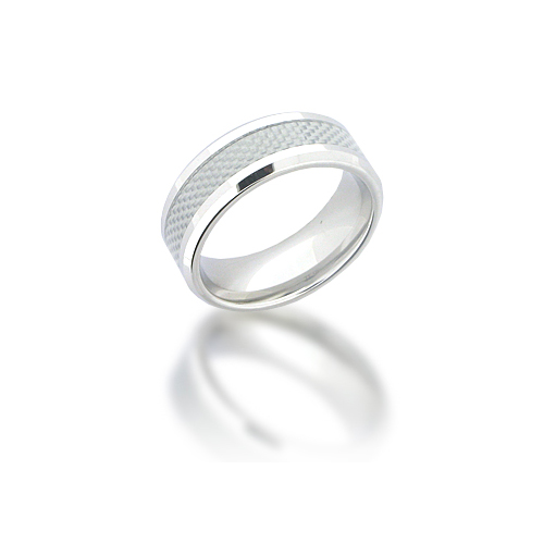 This cobalt chrome ring features gray carbon fiber inlay and polished, beveled edges. Deluxe comfort fit ring is made in the USA. Width: 8mm. Weight: approx. 8 grams. Cobalt Chrome is a unique alloy blend that consists of cobalt and other substances to form a bright white alternative metal. It is as white as platinum, hypoallergenic, unbreakable, and scratch resistant. These bands are light-weight, inside round comfort fit and very comfortable to wear. This metal has been used in medical applications for years. Occasional polishing may be required.
