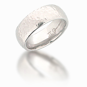 This cobalt chrome ring features a domed, hammered finish. Deluxe comfort fit ring is made in the USA. Width: 8mm. Cobalt Chrome is a unique alloy blend that consists of cobalt and other substances to form a bright white alternative metal. It is as white as platinum, hypoallergenic, unbreakable, and scratch resistant. These bands are light-weight, inside round comfort fit and very comfortable to wear. This metal has been used in medical applications for years. Occasional polishing may be required. Weight: approx. 9 grams.