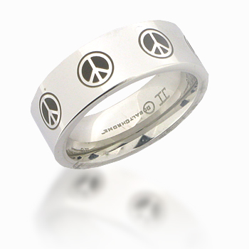 This 8mm cobalt chrome ring features laser engraved peace symbols. Deluxe comfort fit ring is made in the USA. Weight: approximately 10 grams. Cobalt Chrome is a unique alloy blend that consists of cobalt and other substances to form a bright white alternative metal. It is as white as platinum, hypoallergenic, unbreakable, and scratch resistant. These bands are light-weight, inside round comfort fit and very comfortable to wear. This metal has been used in medical applications for years. Occasional polishing may be required.