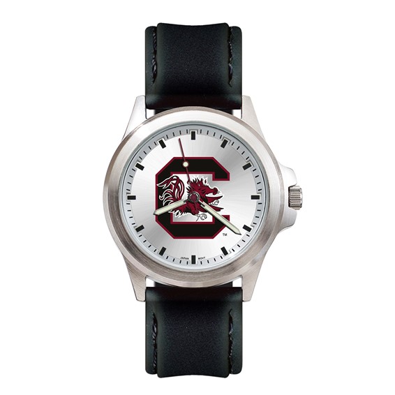 The men's University of South Carolina Fantom watch features a sunray silver tone dial ring. This sport watch has luminous hour and minute hands with second hand in team color. Case dimensions: 1 5/8in x 1 3/4in. Dial diameter: 1 1/16in. Brushed chrome finish alloy case and stainless steel back. Soft padded stitched edge leather strap with stainless steel buckle. Miyota Japanese quartz movement. Water resistant. Packaged in rectangular tin gift box. Limited lifetime warranty.