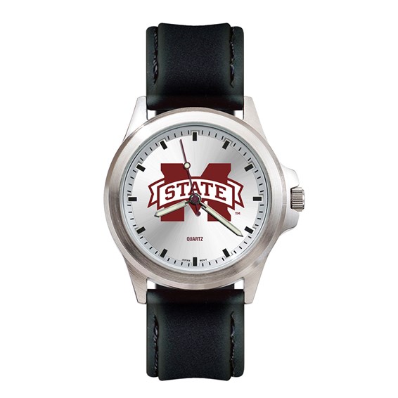 The men's Mississippi State University Fantom watch features a sunray silver tone dial ring. This sport watch has luminous hour and minute hands with second hand in team color. Case dimensions: 1 5/8in x 1 3/4in. Dial diameter: 1 1/16in. Brushed chrome finish alloy case and stainless steel back. Soft padded stitched edge leather strap with stainless steel buckle. Miyota Japanese quartz movement. Water resistant. Packaged in rectangular tin gift box. Limited lifetime warranty.