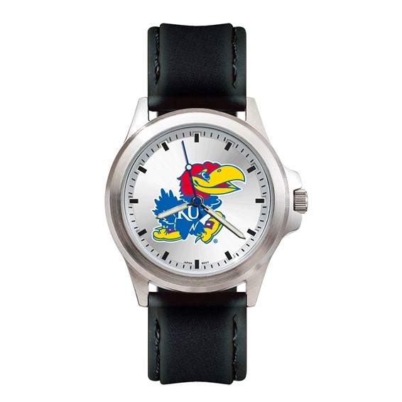The men's University of Kansas Fantom watch features a sunray silver tone dial ring. This sport watch has luminous hour and minute hands with second hand in team color. Case dimensions: 1 5/8in x 1 3/4in. Dial diameter: 1 1/16in. Brushed chrome finish alloy case and stainless steel back. Soft padded stitched edge leather strap with stainless steel buckle. Miyota Japanese quartz movement. Water resistant. Packaged in rectangular tin gift box. Limited lifetime warranty.