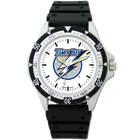 The Tampa Bay Lightning Option Watch is a hit with sports fans of all ages. The watch case and bezel are made from stainless steel. Case is 1 1/2in wide, dial diameter 1in. The 8in coordinating strap is made from polyurethane. Team logo is shown boldly in the center of the watch. The Option Watch model features precision Citizen movement, and has hour, minute and second hands. Water resistant. Packaged in an attractive case. Two year limited warranty.