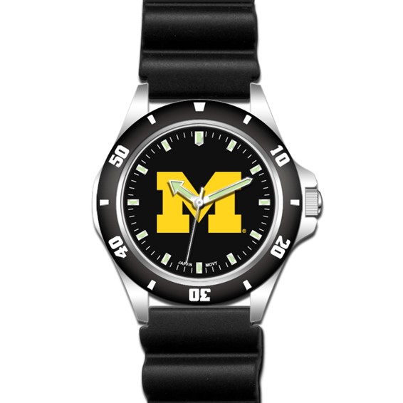 University of Michigan challenger watch has a chrome ABS plastic resin case and stainless steel snap back. Case is 1 1/2in wide, dial diameter 1in. Strap is 8 inches long. Water resistant man's sport watch. Rotating black ABS bezel, acrylic crystal. Black dial with printed hour and minute track. Black PU rubber strap with stainless steel buckle. Miyota quartz movement (#377 battery). Stainless steel crown, three hands. Limited lifetime warranty on watch.
