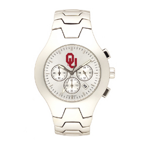 University of Oklahoma hall of fame watch has a stainless steel watch case with stainless steel oval-shaped chronograph pushers. School logo is shown above the subdials. The Hall of Fame™ model features a Citizen® chronograph movement with date window and has Swiss luminous diamond cut hands. Solid stainless steel polished bracelet with butterfly clasp. The mineral glass lens has a non-reflective coating. Water-resistant to 10 ATM. Showcased in an aluminum gift box. Two year limited warranty.