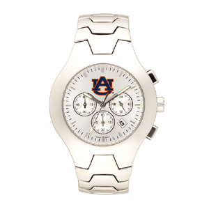 Auburn University Hall of Fame watch boasts a polished stainless steel watch case with stainless steel oval-shaped chronograph pushers. Team logo is shown above the subdials. The Hall of Fame™ model features a Citizen® chronograph movement with date window and has Swiss luminous diamond cut hands. Solid stainless steel polished bracelet with butterfly clasp. The mineral glass lens has a non-reflective coating. Water-resistant to 10 ATM. Showcased in an aluminum gift box. Two year limited warranty.