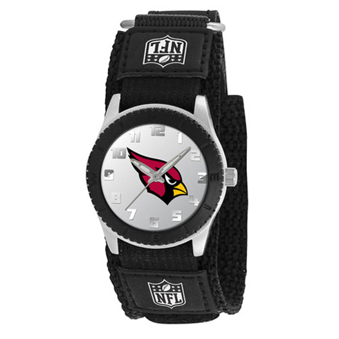 The black Arizona Cardinals Rookie watch for young men features a round silver dial with team logo, stainless steel back and adjustable Velcro strap. Maximum wrist size: six inches. It has quartz accuracy. It is shock resistant and water resistant. Limited lifetime warranty. Import.Strap Length: 5.5 in - 7 inWeight: 0.35 lbWidth: 34 mmCase: 31 mmLug: 12 mmThickness: 11 mmPackaged Dimensions: 3.25in W x 9in L x 0.75in HBattery: SR626 (1)