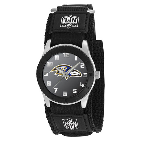 The black Baltimore Ravens Rookie watch for young men features a round dial with team logo, stainless steel back and black adjustable Velcro strap. Maximum wrist size: six inches. It has quartz accuracy. It is shock resistant and water resistant. Limited lifetime warranty. Import.Strap Length: 5.5 in - 7 inWeight: 0.35 lbWidth: 34 mmCase: 31 mmLug: 12 mmThickness: 11 mmPackaged Dimensions: 3.25in W x 9in L x 0.75in HBattery: SR626 (1)