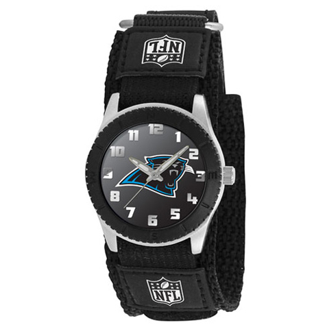 The black Carolina Panthers Rookie watch for young men features a round black dial with team logo, stainless steel back and black adjustable Velcro strap. Maximum wrist size: six inches. It has quartz accuracy. It is shock resistant and water resistant. Limited lifetime warranty. Import.Strap Length: 5.5 in - 7 inWeight: 0.35 lbWidth: 34 mmCase: 31 mmLug: 12 mmThickness: 11 mmPackaged Dimensions: 3.25in W x 9in L x 0.75in HBattery: SR626 (1)