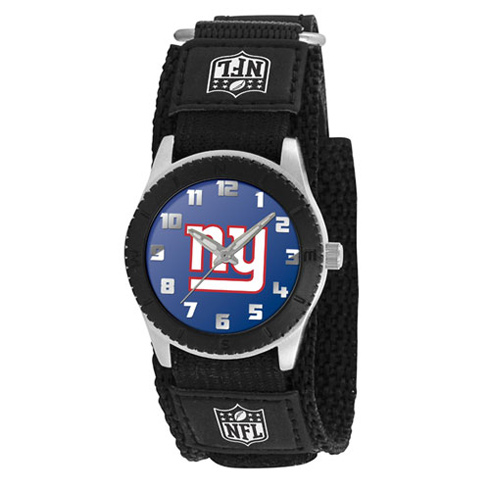 The black New York Giants Rookie watch for young men features a round dial with team logo, stainless steel back and black adjustable Velcro strap. Maximum wrist size: six inches. It has quartz accuracy. It is shock resistant and water resistant. Limited lifetime warranty. Import.Strap Length: 5.5 in - 7 inWeight: 0.35 lbWidth: 34 mmCase: 31 mmLug: 12 mmThickness: 11 mmPackaged Dimensions: 3.25in W x 9in L x 0.75in HBattery: SR626 (1)