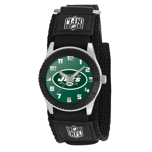 The black New York Jets Rookie watch for young men features a round dial with team logo, stainless steel back and black adjustable Velcro strap. Maximum wrist size: six inches. It has quartz accuracy. It is shock resistant and water resistant. Limited lifetime warranty. Import.Strap Length: 5.5 in - 7 inWeight: 0.35 lbWidth: 34 mmCase: 31 mmLug: 12 mmThickness: 11 mmPackaged Dimensions: 3.25in W x 9in L x 0.75in HBattery: SR626 (1)