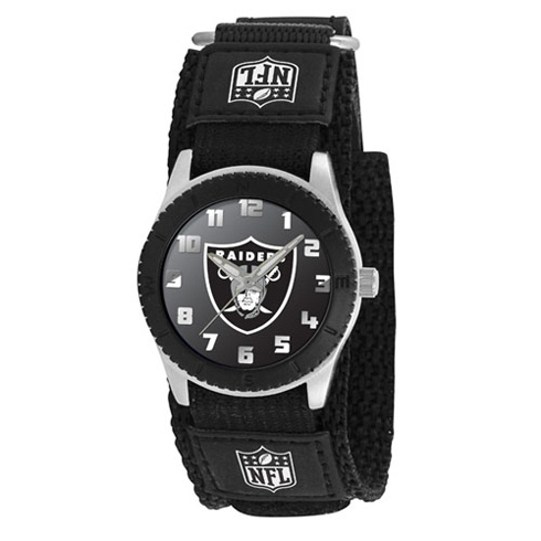 The black Oakland Raiders Rookie watch for young men features a round dial with team logo, stainless steel back and black adjustable Velcro strap. Maximum wrist size: six inches. It has quartz accuracy. It is shock resistant and water resistant. Limited lifetime warranty. Import.Strap Length: 5.5 in - 7 inWeight: 0.35 lbWidth: 34 mmCase: 31 mmLug: 12 mmThickness: 11 mmPackaged Dimensions: 3.25in W x 9in L x 0.75in HBattery: SR626 (1)