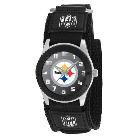 The black Pittsburgh Steelers Rookie watch for young men features a round dial with team logo, stainless steel back and black adjustable Velcro strap. Maximum wrist size: six inches. It has quartz accuracy. It is shock resistant and water resistant. Limited lifetime warranty. Import.Strap Length: 5.5 in - 7 inWeight: 0.35 lbWidth: 34 mmCase: 31 mmLug: 12 mmThickness: 11 mmPackaged Dimensions: 3.25in W x 9in L x 0.75in HBattery: SR626 (1)