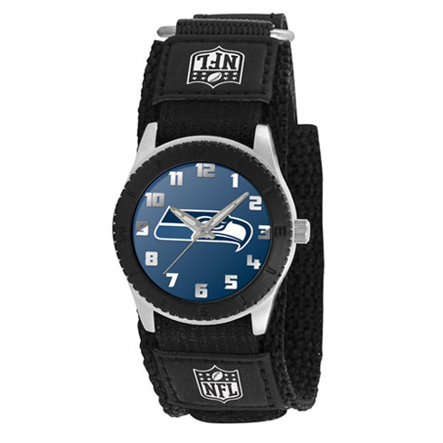 The black Seattle Seahawks Rookie watch for young men features a round dial with team logo, stainless steel back and black adjustable Velcro strap. Maximum wrist size: six inches. It has quartz accuracy. It is shock resistant and water resistant. Limited lifetime warranty. Import.Strap Length: 5.5 in - 7 inWeight: 0.35 lbWidth: 34 mmCase: 31 mmLug: 12 mmThickness: 11 mmPackaged Dimensions: 3.25in W x 9in L x 0.75in HBattery: SR626 (1)