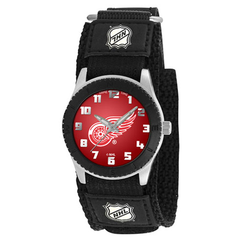 The black Detroit Red Wings Rookie watch for young men features a round red dial with team logo, stainless steel back and adjustable Velcro strap. Maximum wrist size: six inches. It has quartz accuracy. It is shock resistant and water resistant. Limited lifetime warranty. Import.Strap Length: 5.5 in - 7 inWeight: 0.35 lbWidth: 34 mmCase: 31 mmLug: 12 mmThickness: 11 mmPackaged Dimensions: 3.25in W x 9in L x 0.75in HBattery: SR626 (1)