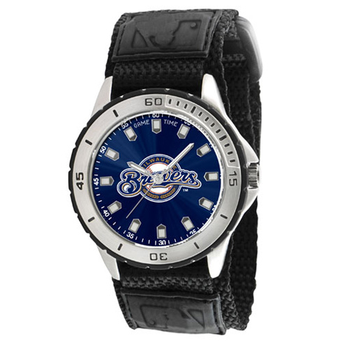 Milwaukee Brewers Veteran watch features an officially licensed team logo, stainless steel back, black velcro band, rotating bezel, and quartz accuracy. It is shock and water resistant to 3ATM. Limited lifetime warranty. Strap Length: 5.5 in - 7.75 inWeight: 0.35 lbWidth: 46 mmCase: 42 mmLug: 22 mmThickness: 11 mmPackaged Dimensions: 2.75in W x 4.5in L x 4.5in HBattery: SR626 (1)