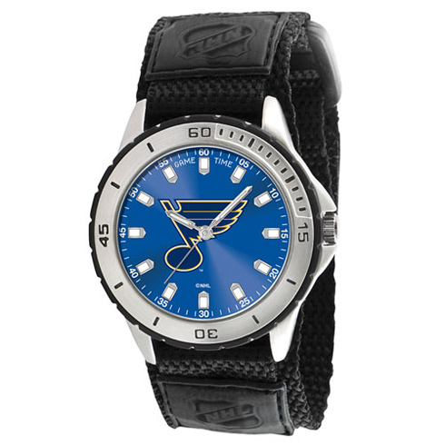 St. Louis Blues veteran watch features an officially licensed team logo, stainless steel back, black velcro band, rotating bezel, and quartz accuracy. It is shock and water resistant to 3ATM. Limited lifetime warranty. Strap Length: 5.5 in - 7.75 inWeight: 0.35 lbWidth: 46 mmCase: 42 mmLug: 22 mmThickness: 11 mmPackaged Dimensions: 2.75in W x 4.5in L x 4.5in HBattery: SR626 (1)