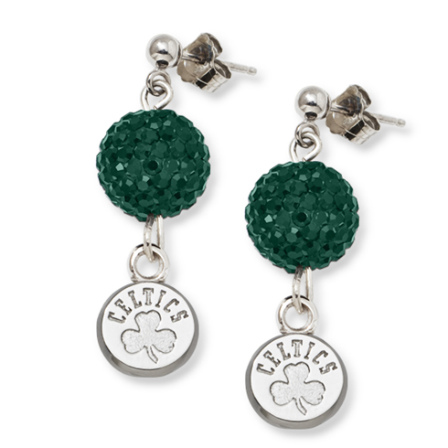 Boston Celtics crystal ovation earrings are crafted in solid sterling silver and richly plated in a rhodium finish. Team logo charm dangles from a sphere glistening with an array of pavé green crystals. Ball post earrings with push backs. Length: 1 1/4in. Width: 3/8in. Depth: 3/8in. Weight: 3.72 grams.
