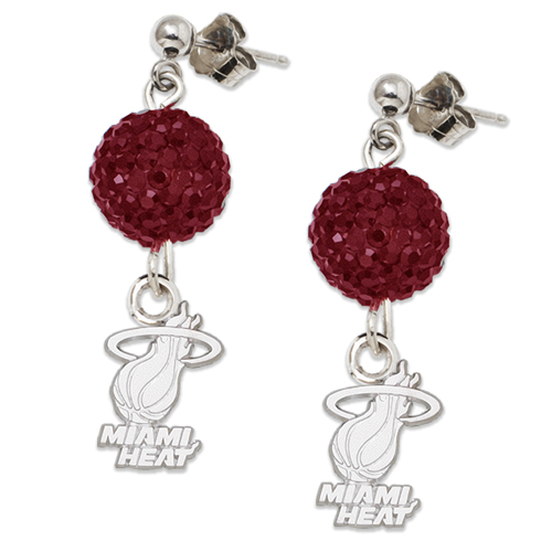 Miami Heat crystal ovation earrings are crafted in solid sterling silver and richly plated in a rhodium finish. Team logo charm dangles from a sphere glistening with an array of pavé red crystals. Ball post earrings with push backs. Length: 1 1/4in. Width: 3/8in. Depth: 3/8in. Weight: 3.93 grams. Made in the USA.