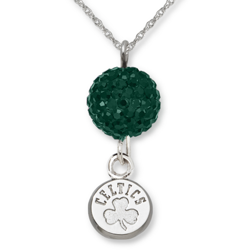 A sterling silver Boston Celtics logo pendant dangles from a sphere glistening with pavé green crystals. 18in sterling silver loose rope chain. Officially licensed. Pendant measures 1 1/16in by 3/8in. Import.