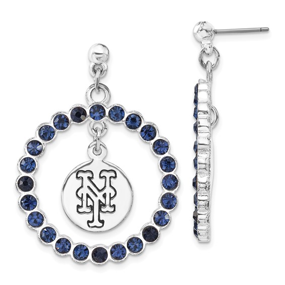 New York Mets spirit crystal earrings have a silver-tone team logo charm enameled in black. A wreath studded with blue crystals surrounds the charm. Item dimensions: 1 1/4in x 1 1/4in. Polished and textured finish. Bullet backs. Shipped in an open view presentation box. Import.