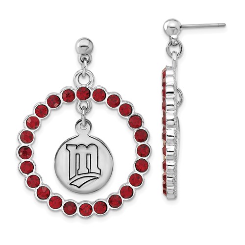 Minnesota Twins spirit crystal earrings have a silver-tone school logo charm enameled in black. A wreath studded with red crystals surrounds the charm. Item dimensions: 1 1/4in x 1 1/4in. Polished and textured finish. Bullet backs. Shipped in an open view presentation box. Import.