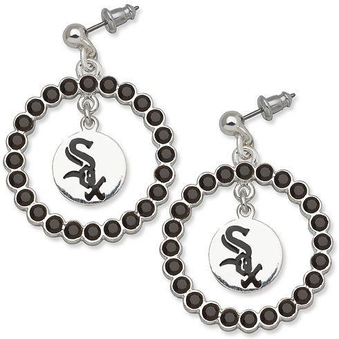 Chicago White Sox spirit crystal earrings have a silver-tone team logo charm enameled in black. A wreath studded with black crystals surrounds the charm. Item dimensions: 1 1/4in x 1 1/4in. Polished and textured finish. Bullet backs. Shipped in an open view presentation box. Import.