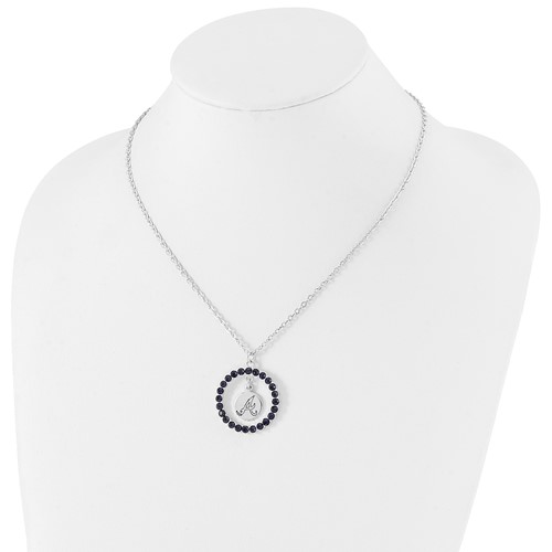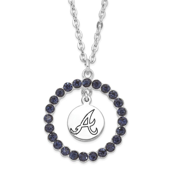 Atlanta Braves Spirit necklace features a silver-tone charm, deeply engraved with the logo of your favorite team and strikingly enameled in black. A circle surrounds the charm which is studded with blue crystals. Item dimensions: 1 1/4in x 1 1/4in. Import. 18in silver-tone chain with lobster clasp.