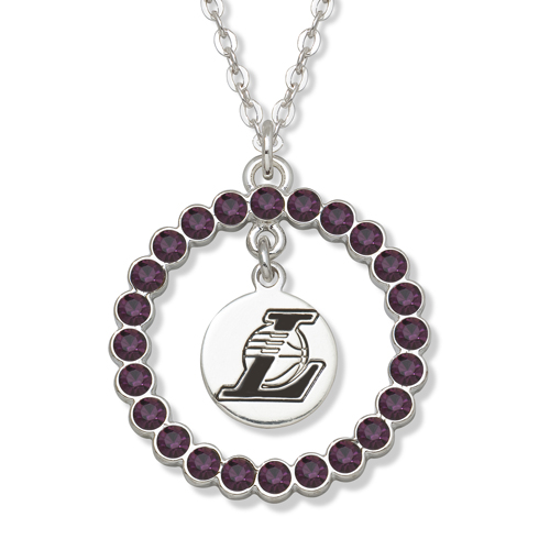 The Los Angeles Lakers Spirit necklace features a silver-tone charm, deeply engraved with the team logo and strikingly enameled in black. A circle surrounds the charm which is studded with purple crystals. Item dimensions: 1 1/4in x 1 1/4in. 18in silver-tone chain with lobster clasp. Import.