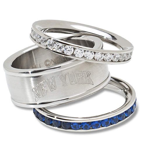 New York Knicks three-piece set includes a wide stainless steel center ring that's precisely etched with your team's name, while the two surrounding eternity rings feature faceted crystals in your team's primary and secondary colors. Set of three stackable rings - two with team color crystals and middle band is stainless steel with team word mark engraved. Comes with leatherette pouch for protection.