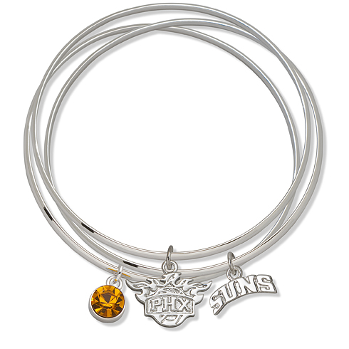 Set of three Phoenix Suns brass bangle bracelets with silver plating finish and E-coating. Bracelets come with three charms: an alloy team word mark charm, alloy team logo charm, and team color Preciosa crystal. Opening of bangles is 2.5in. Bracelets are packaged in cardboard box with clear window and come with a leatherette pouch for protection